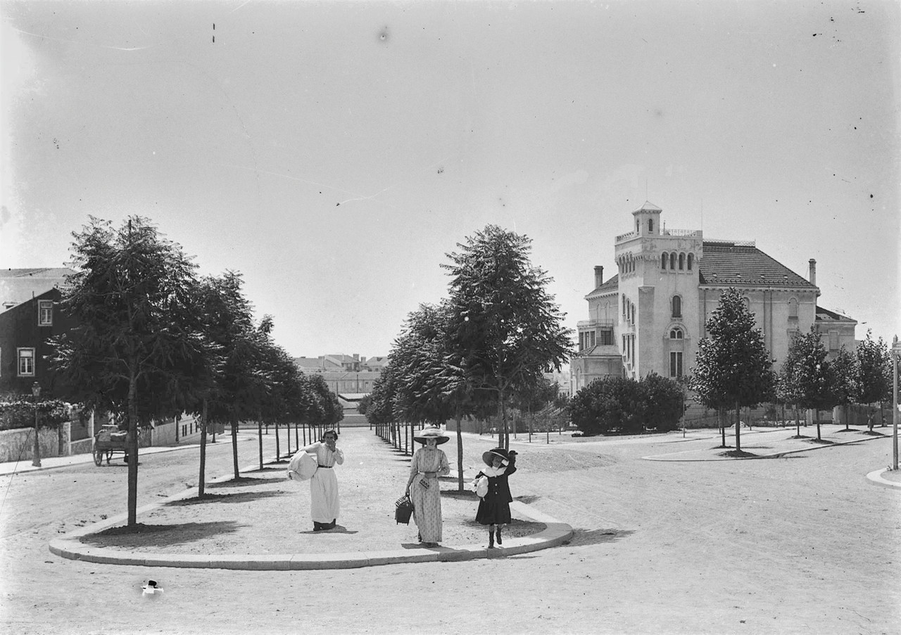 Fotografia: Palacete Silva Graça (depois Hotel Aviz) e senhoras subindo o troço inicial da Av. 5 de Outubro, Lisboa, post. 1908. Joshua Benoliel, in Arquivo Fotográfico da C.M.L.. [Revisto em 20/8/06. Publicado de novo em 28/6/2016 à meia-noute e quarenta.]