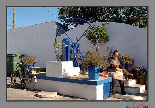 Quem procura imagens da Azinhaga na Internete quase lhe só sai o escritor Saramago. Uma que não é ele é esta aldeã junto à bomba de água, parece que na Rua da Amendoeira. Sempre me fascinou o pitoresco destas bombas de puxar água. Em menino esforçava-me por tirar água dando à manivela mas ela fugia-me das mãos quando dava a volta por cima; eu era muito pequeno. Ao depois cresci e resolvi o problema, mas logo me embaraçava perante a destreza das mulheres da terra girando a manivela em grande velocidade com uma só mão e com a outra apoiada na anca. Eu precisava de usar as duas e demorava sempre mais a encher o cântaro.