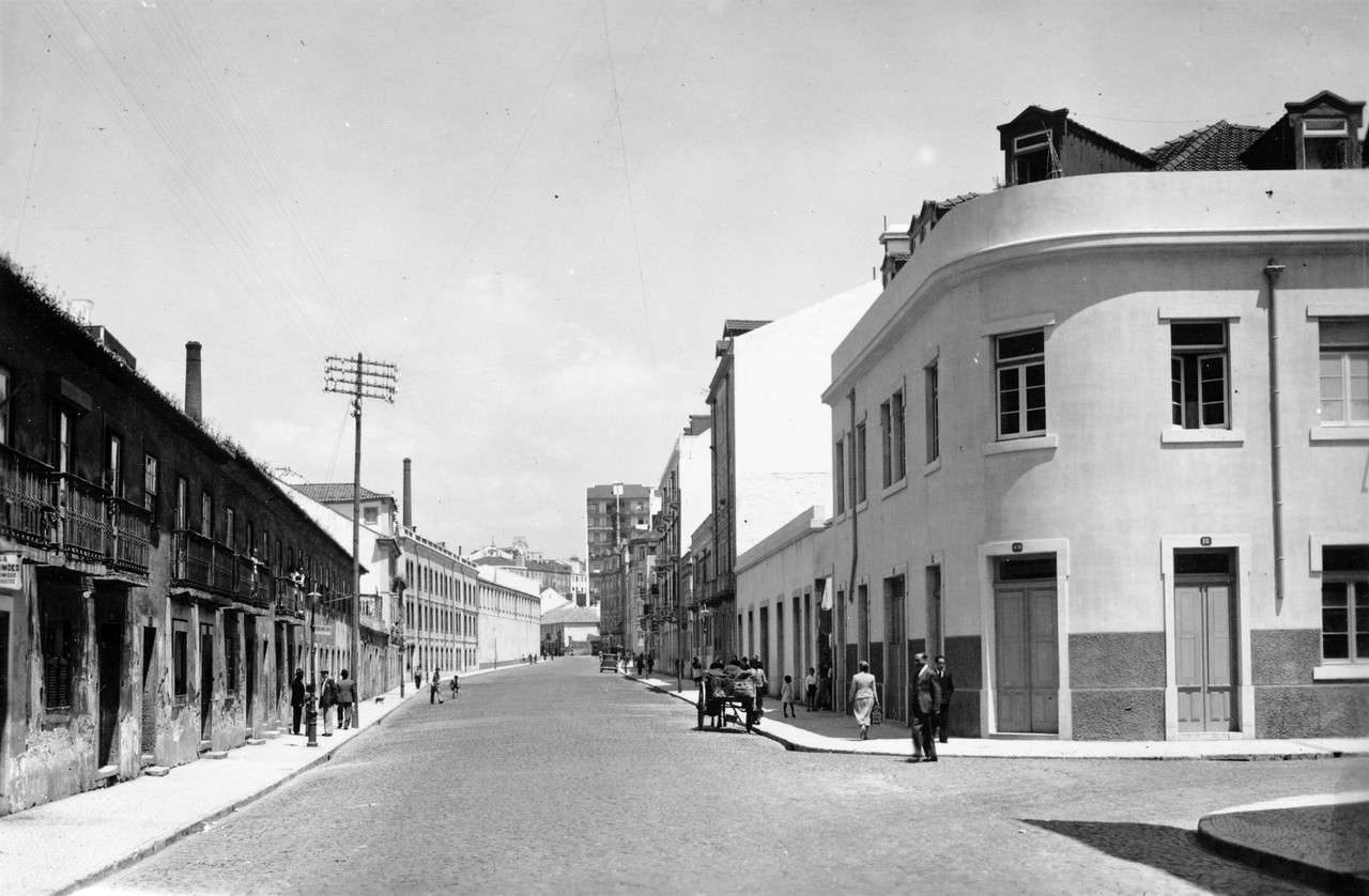 A Rua de Arroios, quem lá passe hoje, parece que encolheu. Este desafogo todo há perto de setenta anos mostra que não fazia concorrência à Av. Almirante Reis. Uma carroça pouco acima do prédio de esquina, no sítio onde foi a fábrica da Cerveja Leão - anteriormente tinha sido ali o palácio do Conde de São Miguel - e umas poucas pessoas fazem todo o movimento da rua. O ar de arrabalde industrial é notório: à esquerda, em segundo plano, a fábrica dos Lanifícios de Arroios, onde foi outro palácio: o dos Condes de Mesquitela. Acho-lhe mais graça assim. Sempre gostei dos arrabaldes industriais de Lisboa com reminiscências de velhos solares e palacetes fidalgos.