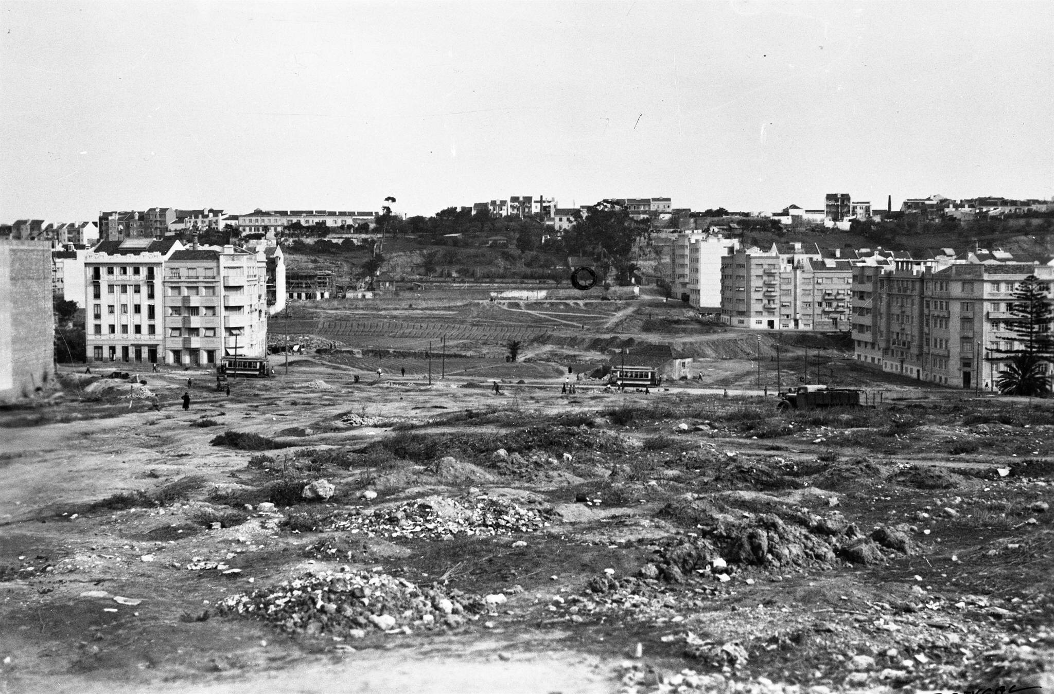 O Estado Novo tem as costas sempre largas quanto à censura de provas, pese embora outros regimes lhe levem a palma no condicionamento das mentes e dos juízos de valor que, voluntária ou involuntariamente, fazemos a partir daí. — Não me leve o meu estimado leitor a mal este à parte, mas a propaganda não deixa ninguém - por mais avesso que seja — imune ao reflexo condicionado. A explicação porém é muito mais simples. Os prédios em questão não estavam construídos à data da fotografia. Admito ter sido construído o prédio dos correios da Alameda e o outro a seguir, que faz esquina com a Rosa Damasceno Actor Isidoro, cerca do meado ou do terceiro quartel dos anos 50.