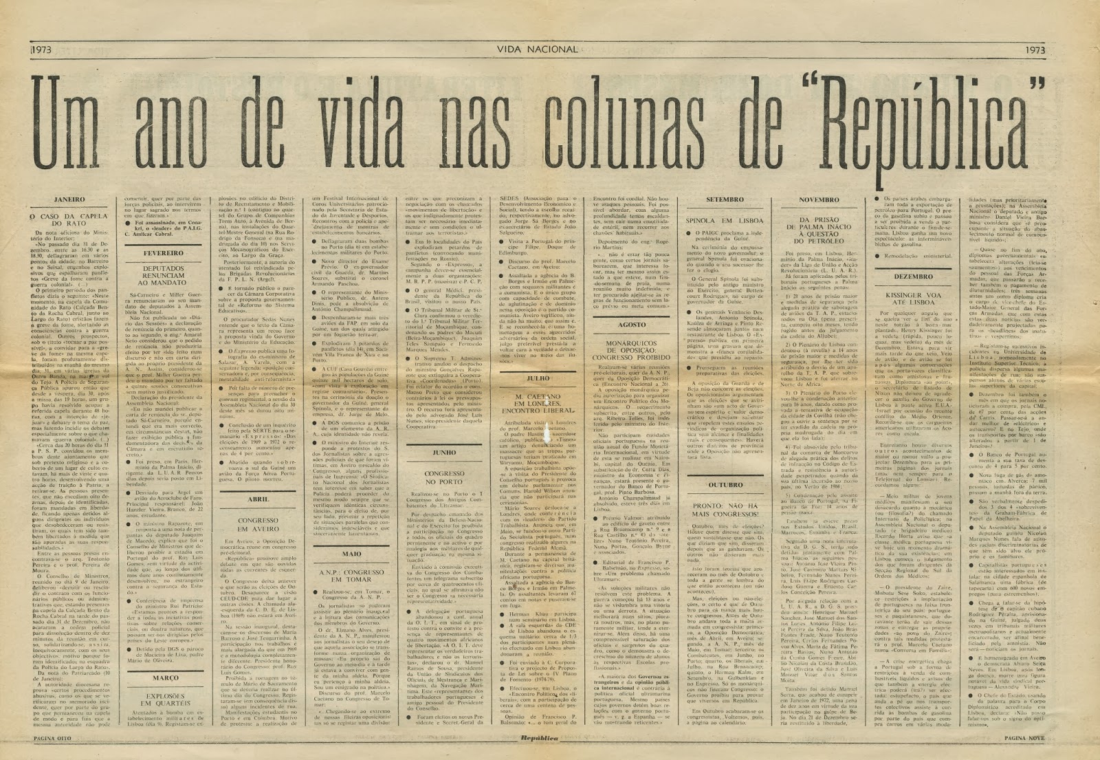 Na Porta da Loja publicam-se paginas d'O Seculo e do Republica com retrospectiva do anno de 1973. Graças ao exame previo, e independentemente d'elle, cada jornal abafava o que não agradava á sua linha editorial: -- o Republica alardeava os actos da opposição ao govêrno em extensos paragraphos, mas os successos adversos á sua lucta dava-os de raspão; assim, o caso da capella do Rato valeu columna e meia [inteira] de jornal, em quanto a eliminação do Amilcar Cabral pelos proprios camaradas do P.A.I.G.C. foi mettida n'uma phrasezinha, não mais. -- O Seculo, por seu lado, mencionava (bem) a visita de Marcello Caetano á Inglaterra, como retribuição da visita a Portugal do principe Philippe pelos 600 annos da Alliança Luso-Britannica; não dava conta da manifestação internacionalista contra Portugal nem das diatribes do padre Hastings ou de Mário Soares nessa occasião, em Londres.