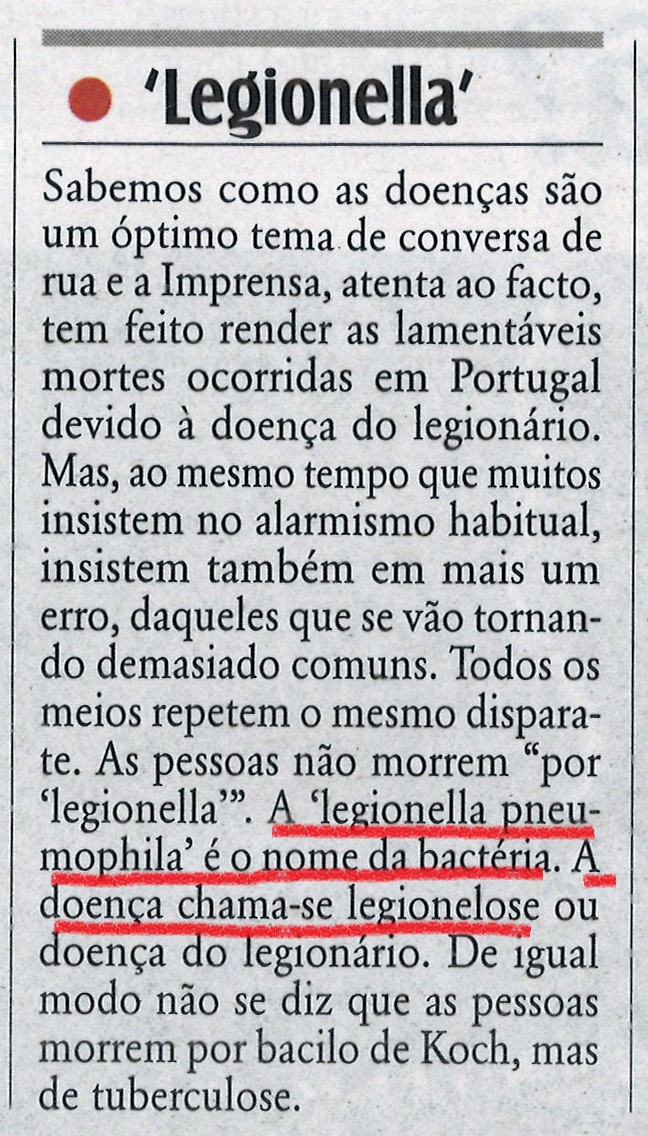 O Caro Bic continua o mesmo incorrigível optimista: acha mesmo que essas alimárias que de gramática – tal como de muitas outras coisas – nada sabem, alguma vez serão capazes de distinguir entre a doença e o seu agente? Ainda por cima, o dito até tem umas consoantes duplas que ficam sempre bem nestas coisas e sempre dá um ar muito «in» na «redássão» o que já não acontece com o prosaico nome da doença; logo…