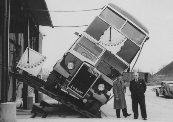 Teste de inclinação dum Leyland Titan levado a cabo em 1949 na fábrica de Chiswick da London Transport Executive (autoridade de transportes londrina). O autocarro é idêntico aos primeiros dois de dois pisos comprados pela Carris em Junho de 47. Os cavalheiros que se punham a jeito de apanhar com o autocarro, caso tombasse, eram o chefe de serviço da Park Royal Vehicles, sr. Guilherme Davis, e provavelmente o inspector do Ministério dos Transportes (o sr. de chapéu).