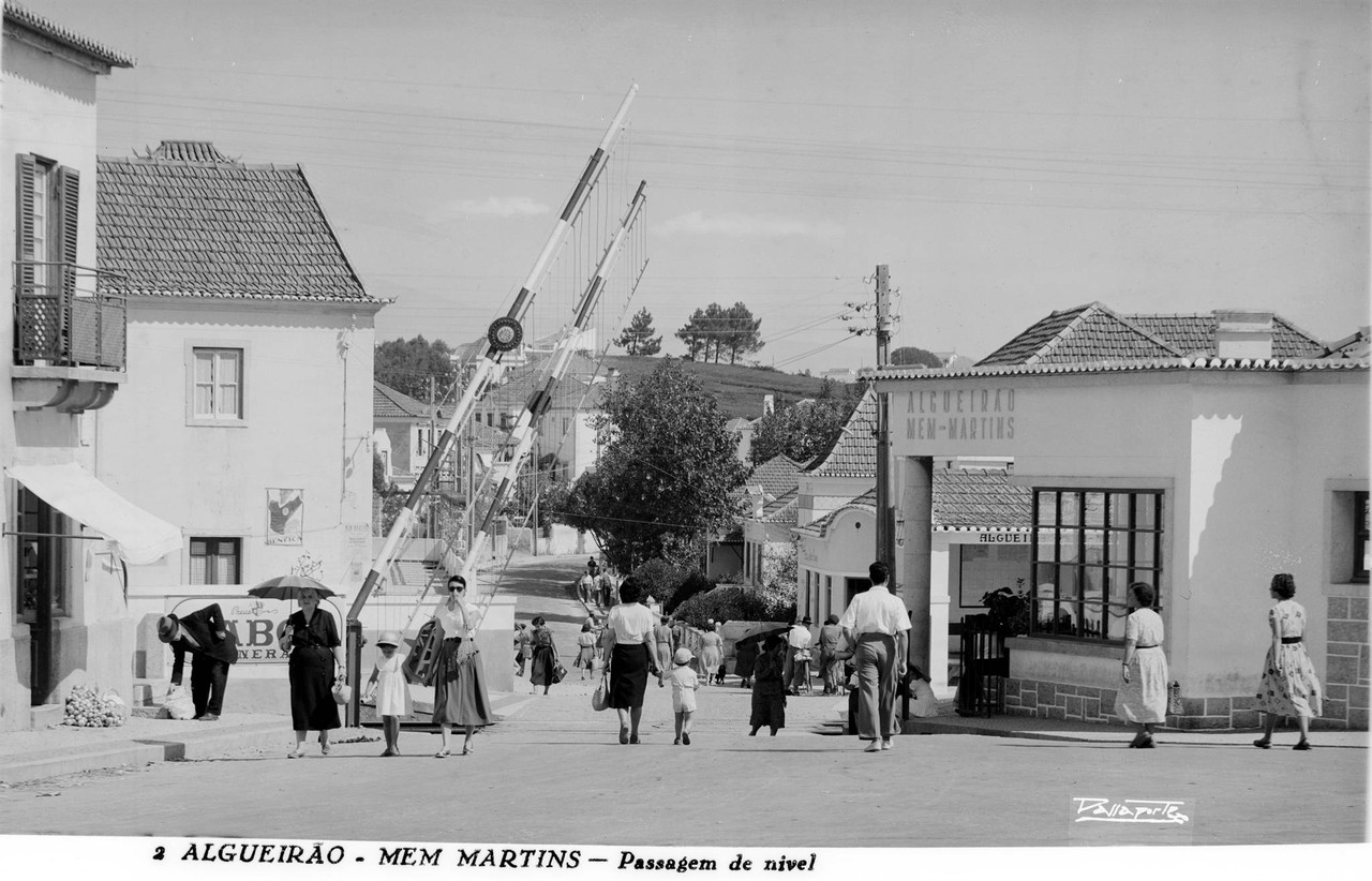 Do ponto do fotógrafo a vista avistava a estrada de Algueirão ladeada de casinhas portuguesas à Raul Lino, alcançando o horizonte: um outeiro com pinheiros (Casal da Cavaleira?). Em Portugal havia este lugar aprazível para morar ou para ir de comboio. Tome o benévolo leitor por lá modernamente as vistas nos sapatos do fotógrafo a ver a pós-moderna e tão apregoada mobilidade barrada (e borrada) nos muros que segregam a gare de embarque das ruas adjacentes. -- Não fora a derrocada do comunismo e Berlim mai-los subúrbios da Alemanha oriental haviam de se desmoronar de inveja. -- A vantagem no entanto é de quem embarque no comboio se não agonia com ver do lado de fora as ruas apinhadas de automóveis, redecoradas com os modernaços condomínios que filharam o chão às moradias e o romantismo ao lugar. Um aviso lhe faço, porém: se houver de comprar viagem nos tranvias saiba que não paga só a viagem; é-lhe exigido que adquira disciplinada e prèviamente o direito de poder comprar bilhete: um cartãozinho de 100 mil réis. Mas, sossegue: a companhia dos caminhos de ferro que lhe solìcitamente vende o bilhetinho de comboio vende-lhe com a mesma generosidade o direito prévio obrigatório de poder comprá-lo. Sem direito a reembolso.
