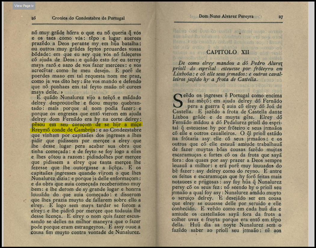 [...] e porque os engreses que entõ vierom em ajuda delrey dom Fernãdo era[m] hy na corte delrey, pesou em seu coraçom de se hijr a miçe Rreymõ [*] conde de Cambrijs: e ao Conde estabre que vinham por capitaães dos jngreses a lhes pidir que pidissem por merçee a elrey que lhe desse lugar pera acabar sua obra que tinha começada [...]