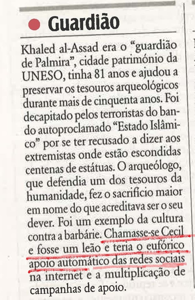 O que diz o recorte é verdade, especialmente a parte dos humanos e o leão. Mas de Palmyra já alguém viu realmente o templo rebentado? Eu não. Nem, parece, os das notícias.
