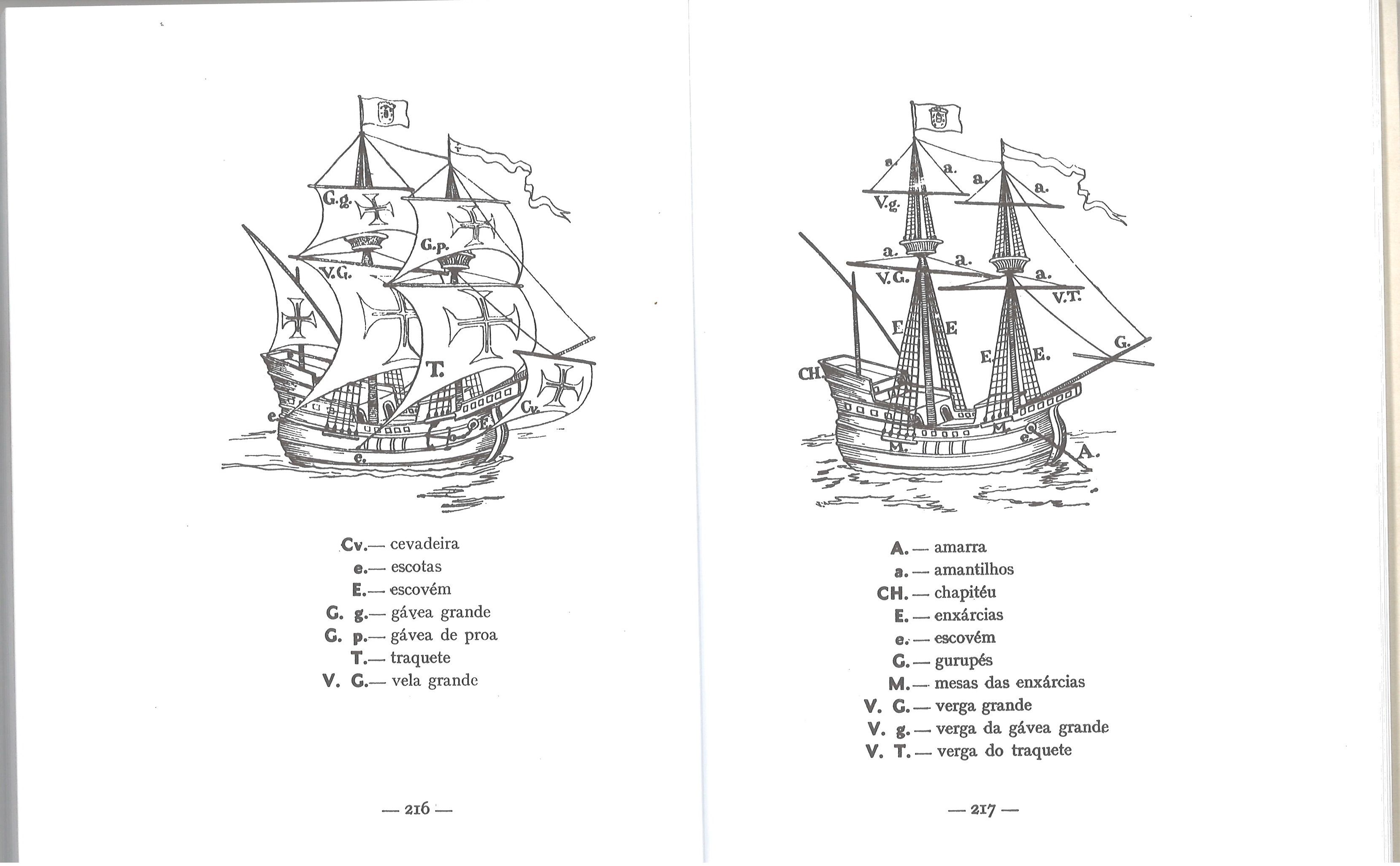 CEVADEIRA — Vela que pendia de uma verga atravessada no gurupés. ESCOTA — Cabo de que uma extremidade se fixa no punho inferior (isto é, no canto inferior) de uma vela e que serve para esticar a vela de maneira que receba bem o vento. ESCOVÉM — Abertura na proa, por onde passam as amarras que se prendem às âncoras. GÁVEA — A segunda vela do mastro grande, a que está acima da vela grande. Gávea de proa: segunda vela do mastro de proa, a que está acima do traquete. PAPA-FIGOS — As velas redondas mais baixas, isto é, a vela grande e o traquete. TRAQUETE — A mais baixa e maior vela redonda do mastro de proa. É um dos papa-figos. Primeiramente chamou-se «traquete» a qualquer vela redonda em geral, e «traquetes de gávea» ao que depois se chamou «gáveas». |