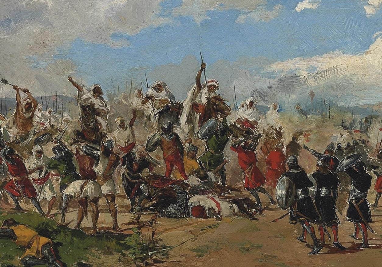 Acercou-se Rodrigo com a flor da nobreza espanhola e os filhos dos seus reis, os quais, ao verem o número e disposição dos muçulmanos, tiveram uma conferência e disseram uns aos outros: