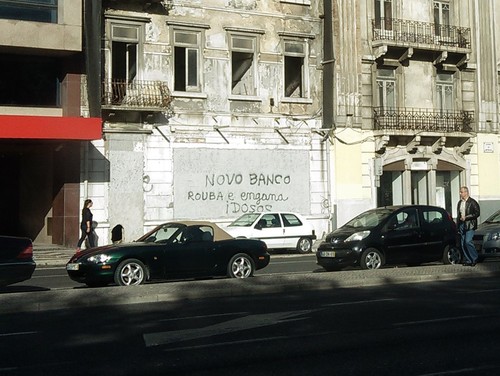 Há meses gente despeitada (e diz que esbulhada) pelo Novo Banco desabafou ali no sempre «inspirado» estilo da arte urbana. Ora quem tenha memória da célebre frase [com Vossa licença] «Bibi é rabo» grafiteiramente chapada no n.º 48 da Alameda de Dom Afonso Henriques em Lisboa, lembrar-se-á que durou ela ali pelos anos 80 e em boa parte dos 90 até que uma alma caridosa a de lá limpou. Foi pena porque se perdeu um raro exemplar rupestre de incalculável valor do que o município e a própria civilização com aplauso geral vieram, e muito bem, a classificar e a promover como «arte urbana».