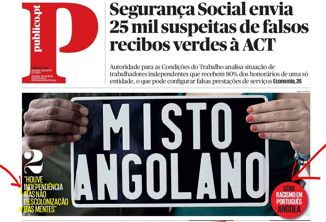 A 1.ª página, hoje, do Público, jornal europeu do ano, jornal mais bem desenhado em Portugal & Espanha [perdão, Espanha & Portugal]; série racismo em português em Angola: houve independência sem descolonização das mentes.