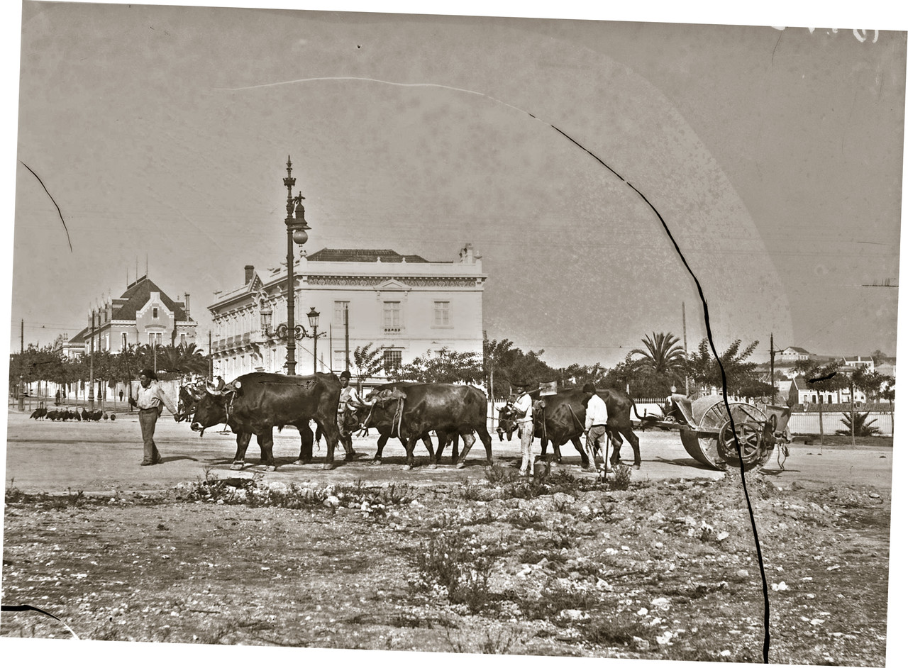 Operarios calcam a Rotunda com cilindro puxado por bois, Lisboa, post 1901.Photographo não identificado. Archivo photographico da C.M.L.
