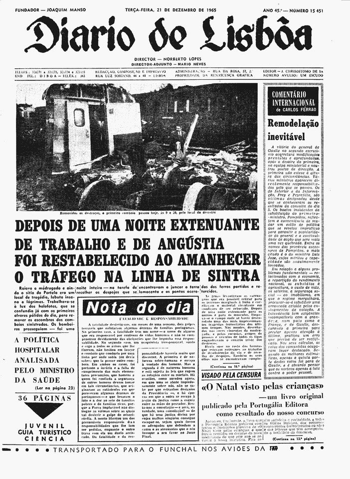 Os idiotas que lá misturam a P.I.D.E. e a censura podiam ler com proveito o insuspeito Diário de Lisbôa de 21/12/1965 fotocopiado para o Mundo pelo «pai da democracia» lá na fundação que a rica dita lhe subvenciona. Está tudo no jornal, expressamente visado pela censura e em melhor reportagem dos factos do que livremente se hoje lê na imprensa, aposto. Fàcilmente perceberiam (ou não, dependendo do embotamento doutrinário) que contar e identificar vítimas esquartejadas por acidente tão violento como o que se deu é mais difícil que trautear a tabuada. É ler o jornal, por conseguinte, e o do dia seguinte também para ver como o inquérito foi entregue à Polícia Judiciária por se ver o Delegado da Procuradoria-Geral da República da comarca de Sintra a braços com tanto trabalho, já então, que não seria capaz de produzir conclusões em tempo útil. Eis a pista. Calhando a curiosidade histórica actual dar em vasculhar o arquivo da P.J. talvez nele ache as almejadas provas da conspiração do silêncio entre o «fâchismo» e a C.P. que alguns doutrinadamente atribuem ao caso. À parte isso outra conclusão mais simples — e não serão precisos grandes trabalhos para lhe chegar — é que a memória é curta e atraiçoa. Se partirmos do erro de que a tragédia foi três dias depois de ter sido, em poucos jornais dessa data errada lhe acharemos notícias. Isto se as sequer procurássemos, claro, como apesar de tudo parece que foi com o autor do blogo de Algueirão – Mem Martins, sr. Hugo Nicolau, que menciona o Correio dos Açores como fonte da notícia que deu do caso.