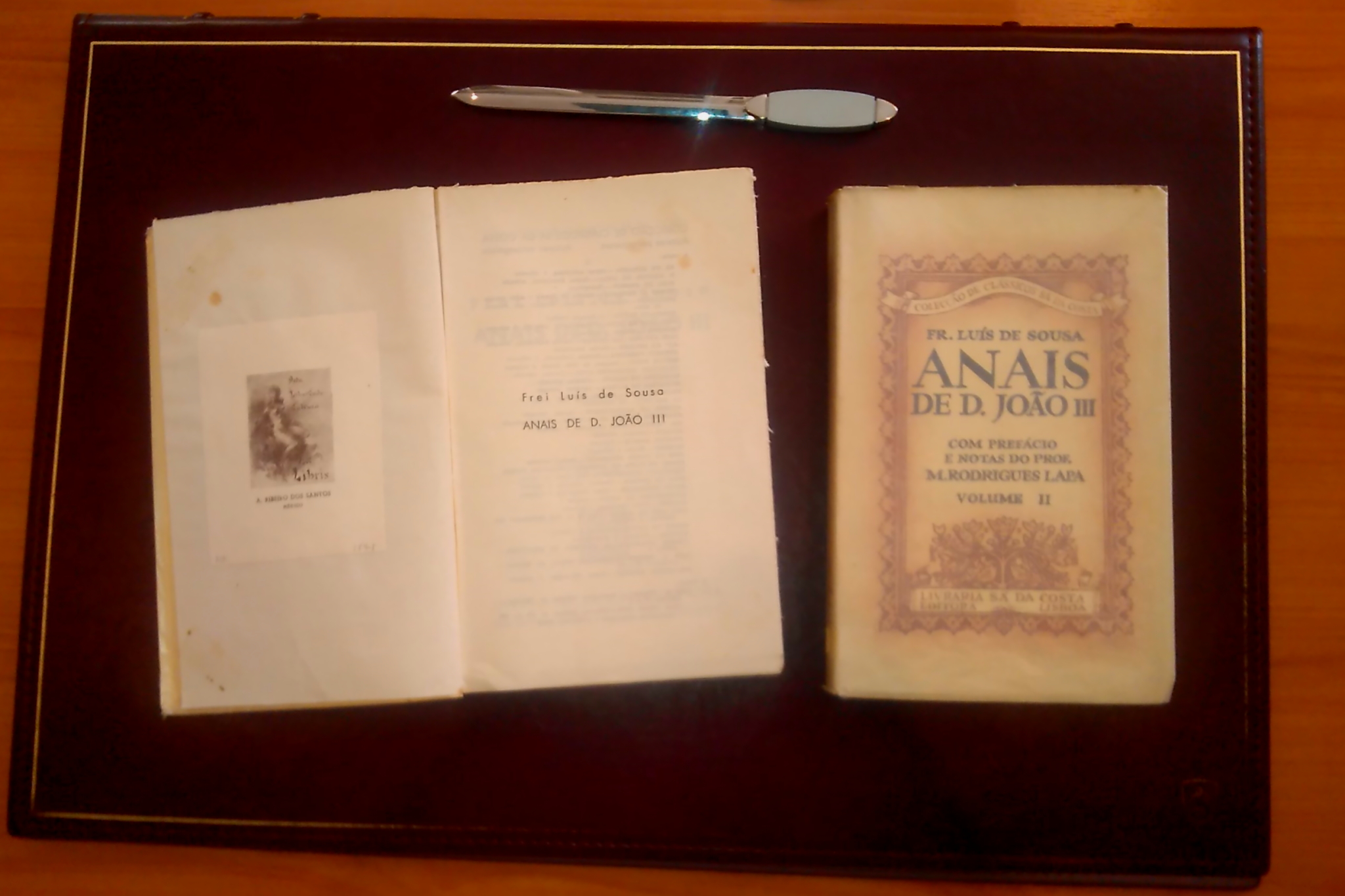Chega-me à mão o pacote com os dois volumezinhos dos «Anais de D. João III», pref. e notas do prof. Rodrigues Lapa, da Colecção de Clássicos Sá da Costa. São da 2.ª ed., 1951 e 1954 (I e II vol. respectivamente). Trazem capas de brochura originais esmeradamente guardadas com fino papel vegetal, etiquetadas no fundo da lombada com os n.ºs 808-8 e 808-9; ex-libris com divisa Vida, Liberdade, Cultura de A. Ribeiro dos Santos, médico (...?). Fios de pó velho na cabeça e ambos os volumes com os cadernos inteiramente por abrir. Nunca foram lidos. Vida demasiado cheia, liberdade de não ler tudo o que havemos numa biblioteca pessoal ou cultura de armazém, leiloada ao pó?