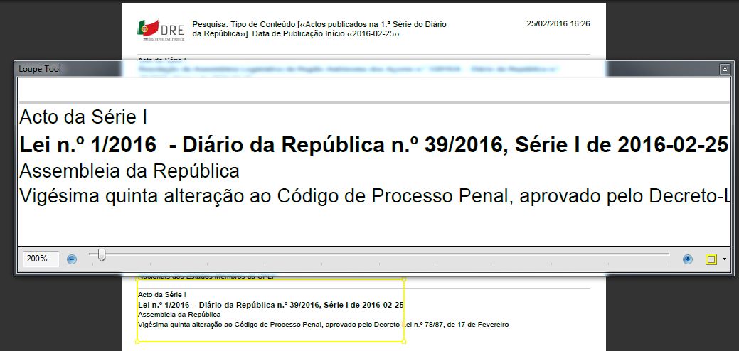 Já me cá referi á natureza pamphletaria da malta esquerdóide que se amesenda em agitada maioria na assembléa legislativa nacional. Tanto assim que me não admira: chegados a 25 de Fevereiro, dia de S. Romeu, quinquagesimo sexto dia do anno, 310 dias para acabar, sae publicada a Lei n.º 1 / 2016. Procede á 25.ª alteração ao Código de Processo Penal, coisa que não iria lá bem só com uma recomendaçãozinha em forma de resolução. Uma trabalheira. Merece a deputação ás Côrtes umas férias de recôbro, não?!...