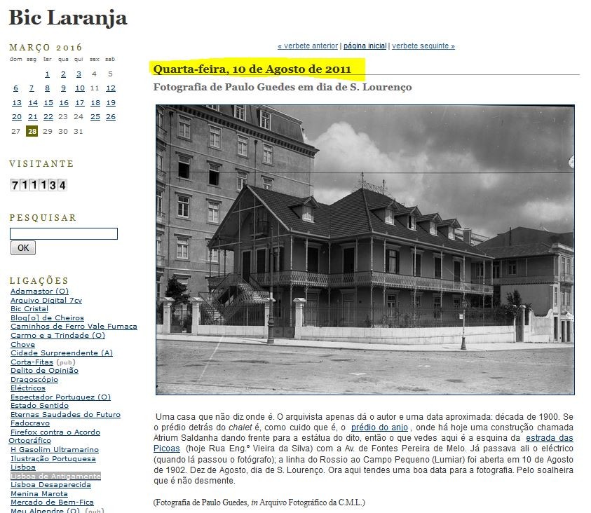 Aquela sensação "familiar" tinha a ver com o "anjo". Depois desta epifania [!!!] o resto foi fácil. Bastou pesquisar no arquivo pela planta topográfica da zona do Saldanha, et voilá! Ali se vê o contorno inconfundível do «Chalet Misterioso» e, logo ao lado, o "prédio do anjo, na esquina da Av. Fontes com a antiga estrada das Picoas (hoje Rua Engº Vieira da Silva). Já quanto à data da foto, a coisa já fia mais fino; a única pista que temos é-nos dada pelo sinal de "Paragem", plantado no candeeiro da esquina. O eléctrico já por ali passava desde 1902, era a carreira 2 (que na altura não tinha número), entre os Restauradores e o Lumiar (Estrada da Torre). Assim sendo, já é possível atribuir a localização exacta e, uma data aproximada, à fotografia d' «O Caso do Chalet Misterioso».[Putativo autor Epifânio], «O último chalet da Avenida Fontes Pereira de Melo» [último?!...], in Lisboa de Antigamente, 27/9/2015 [sublinhados meus].