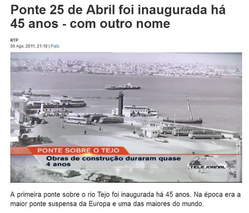 Uma notícia da Radiotelevisão há 5 anos. A Ponte Salazar foi inaugurada com outro nome. Salazar é, decerto, nome sacrílego; afronta a seita laica do advento Abrilino, de maneira que (chiu!) não se diz.