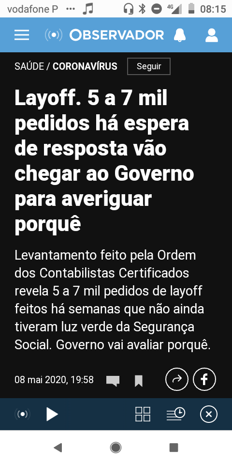 Ana Suspiro, «Layoff [sic]. 5 a 7 mil pedidos há espera [sic] &c», in Observador, 8/V/20.
