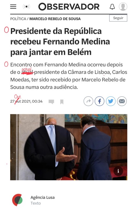 Agora do tempo — o que faz, não o que se mede —, segundo vi no ex-Instituto de Meteorologia, em passando a chuva destes dias vem frio. Vale a notícia o que vale, que é tempo de Outono. Mais vale pelo alarme, o alarmismo. Vamos para Novembro mas, no mundo de jogos de computador em que se esta civilização de recreio de escola infantilizou, são dois fins do mundo: um fim do mundo por frio em Novembro a seguir ao fim do mundo por chuva em fim de Outubro. Ou o fim da macacada. Havemos de nêle acabar todos cheios de saúde, vacinados contra a chuva, o frio e alarmados da trovoada e do vento em geral. Só contra o medinho é que não há remédio, nem com todas as vacinas juntas, mai' las focinheiras. Mas, lá será, viver apavorado é, crêem os govêrnos e os povos agora, uma vida melhor do que morrer de mêdo.