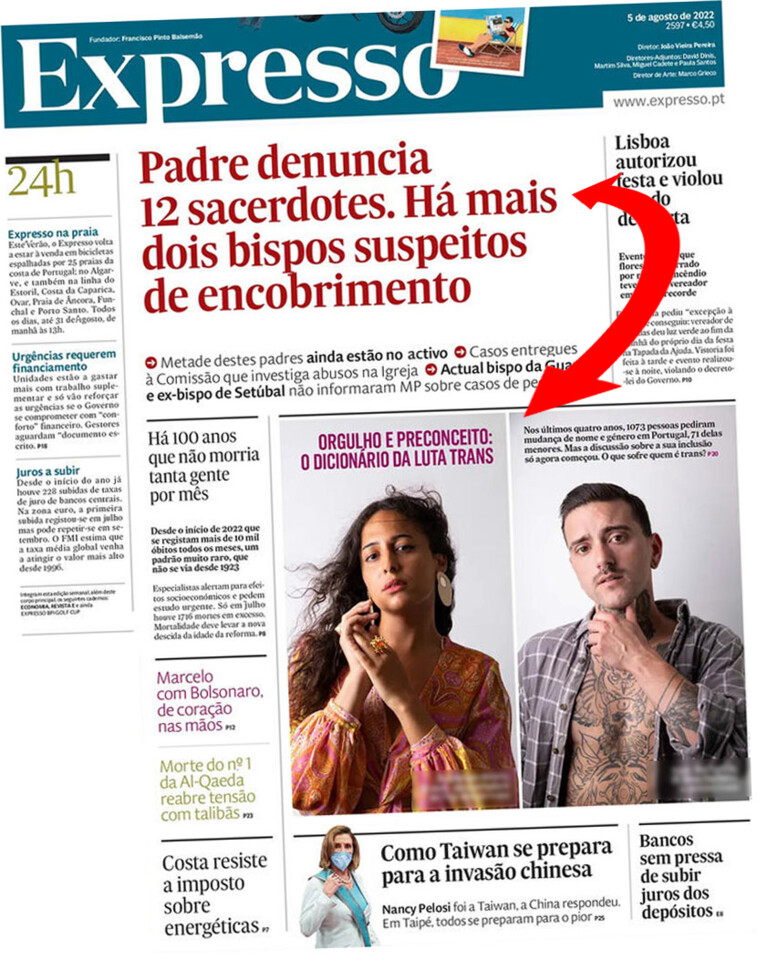 O ferrete anticlecrical do ex-saco de plástico é de catálogo: propõe um vilão agressor (a Igreja) personificado no seu agente essencial: o sacerdote — uma heresia monstruosa, medonha; já as vítimas, coitadinhas, são apresentadas à compaixão do leitor, em dobro: à uma os meninos crentes, comidos pelo papão (salvo seja, mas, a bem da beatitude do jornalixo, não confundir papão com Papa!); à outra os desgraçados homossexuais, enganados por essa construção social opressora que é a anatomia. Um caso complicado!…