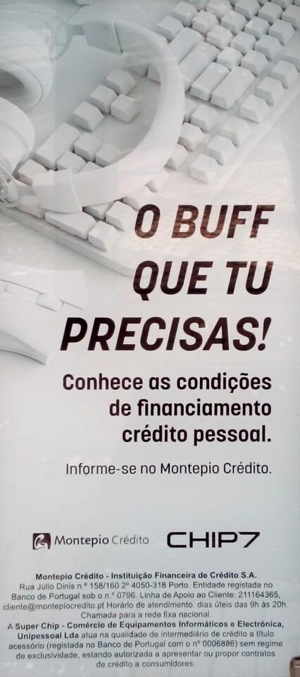 Aos novíssimos, promoção de vendas é português menos moço para dizer marketing. Marketing buffeiro, no caso. O que está bem: — o buff que tu precisas! Conhece [tu] as condições de financiamento pessoal… — Se não fosse pessoal seria financiamento quê? Empresarial? E tratar-se-ão as empresas por tu?…